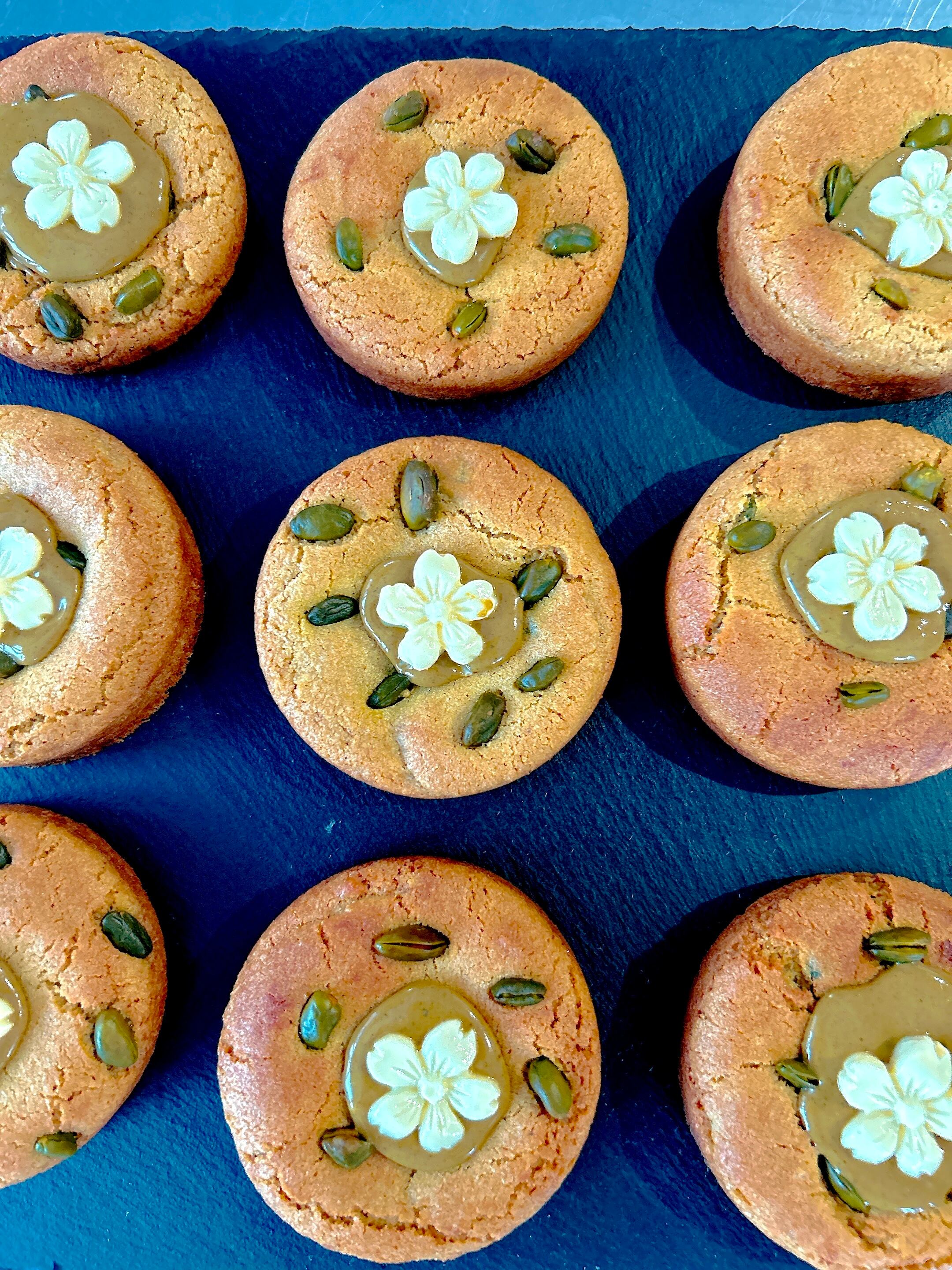 ピスタチオをたっぷり合わせた香ばしい風味のクッキーにピスタチオのガナッシュ、ローストピスタチオを重ねて桜モチーフのホワイトチョコレートで飾っています。中にはフランボワーズのチョコレート入りで味のアクセントがプラスされています。